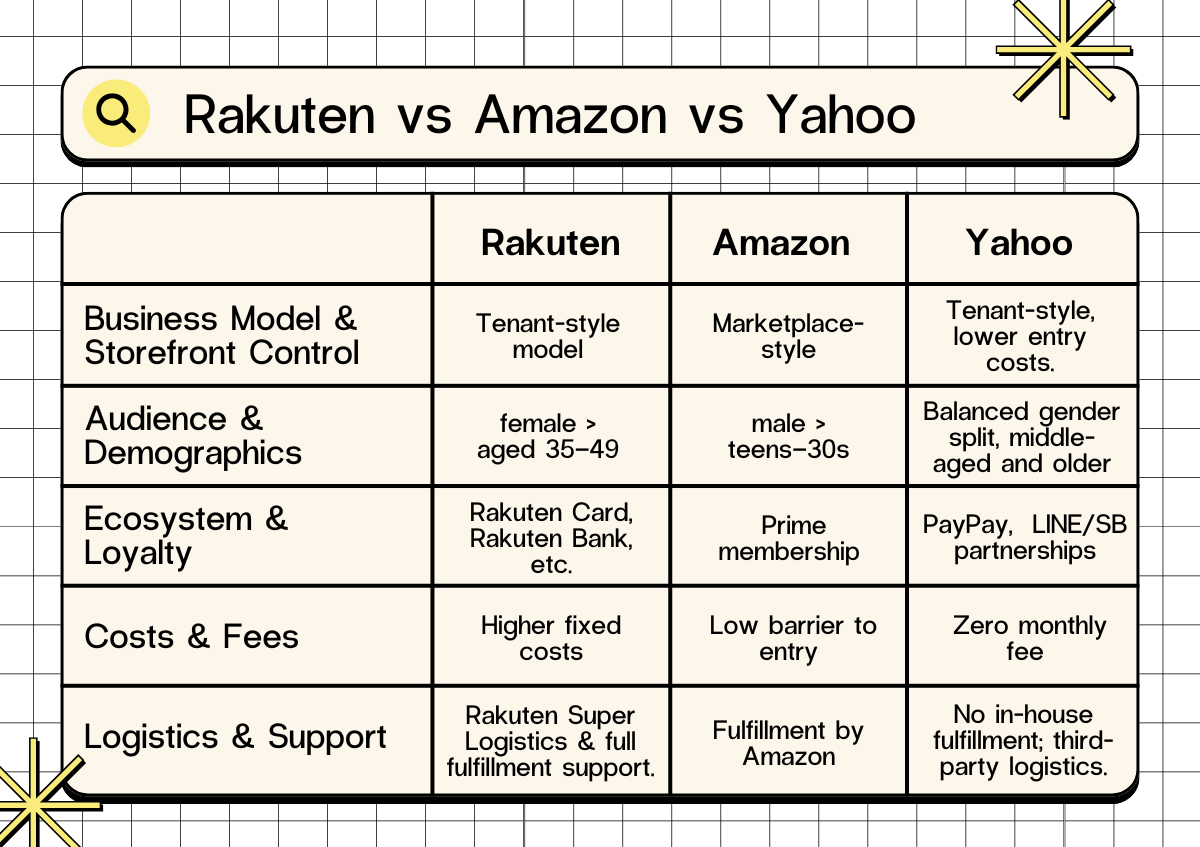 If the budget is tight, Yahoo offers the cheapest entry; Amazon is middle-ground; Rakuten is an investment that requires a clear ROI strategy.