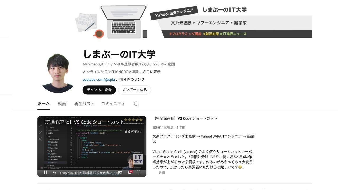 Shimabu taught himself programming, worked as an engineer at Yahoo! JAPAN after graduation, and later began developing new services. On his channel, he offers in-depth videos on front-end technologies like JavaScript, with clear explanations that are beginner-friendly. Many of his videos allow viewers to learn while coding, providing highly practical content for aspiring programmers. He also shares tips on job hunting and information on the latest IT industry news, making his channel a valuable resource for students and young engineers.