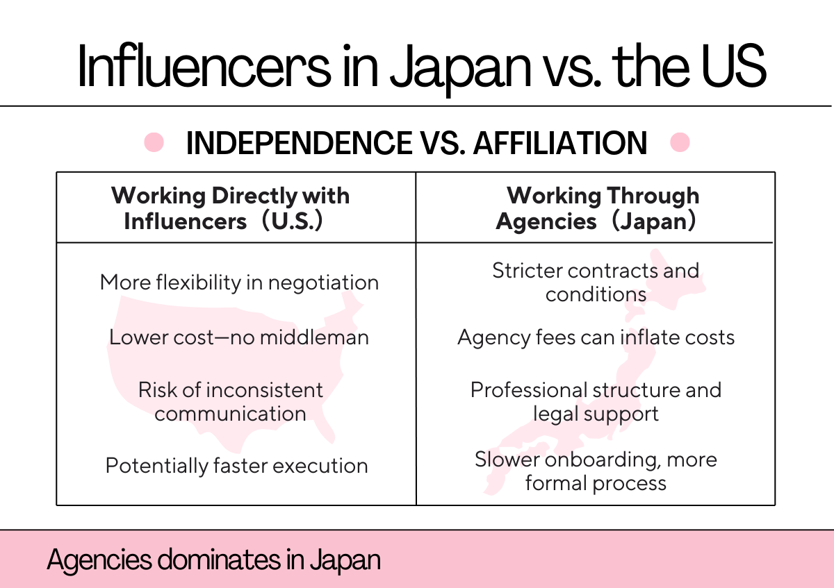 Foreign brands may initially prefer the speed and agility of US-style influencer deals. But in Japan, direct outreach can backfire if the influencer is part of an agency. Bypassing the agency risks damaging relationships or even being ignored entirely.